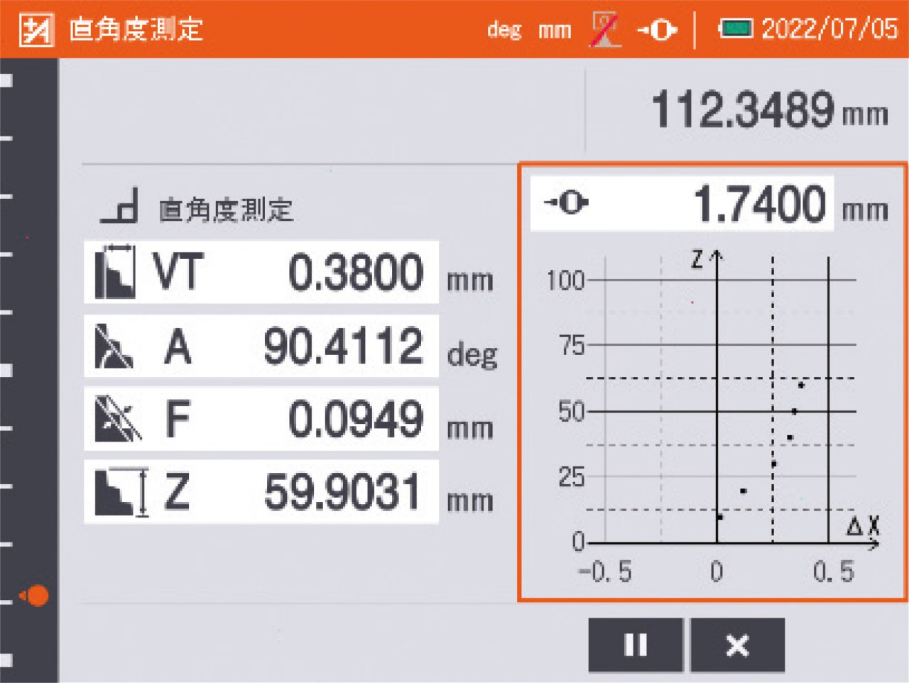 ●圖形、數值顯示的直角度量測結果(須搭配數位指示量錶或槓桿測頭) |