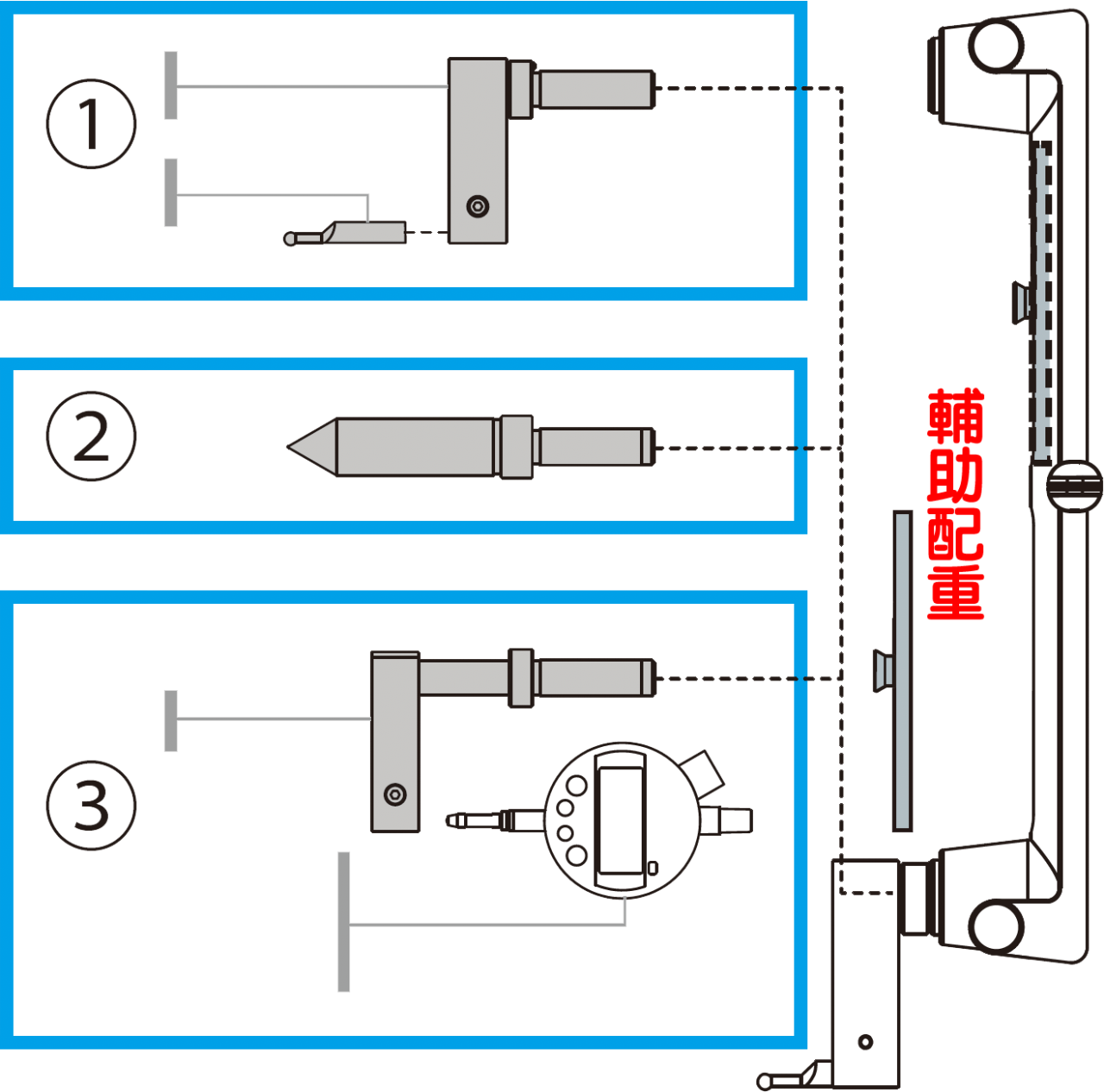 ① 可依量測目的自由組合支架及測針,變更量測區。